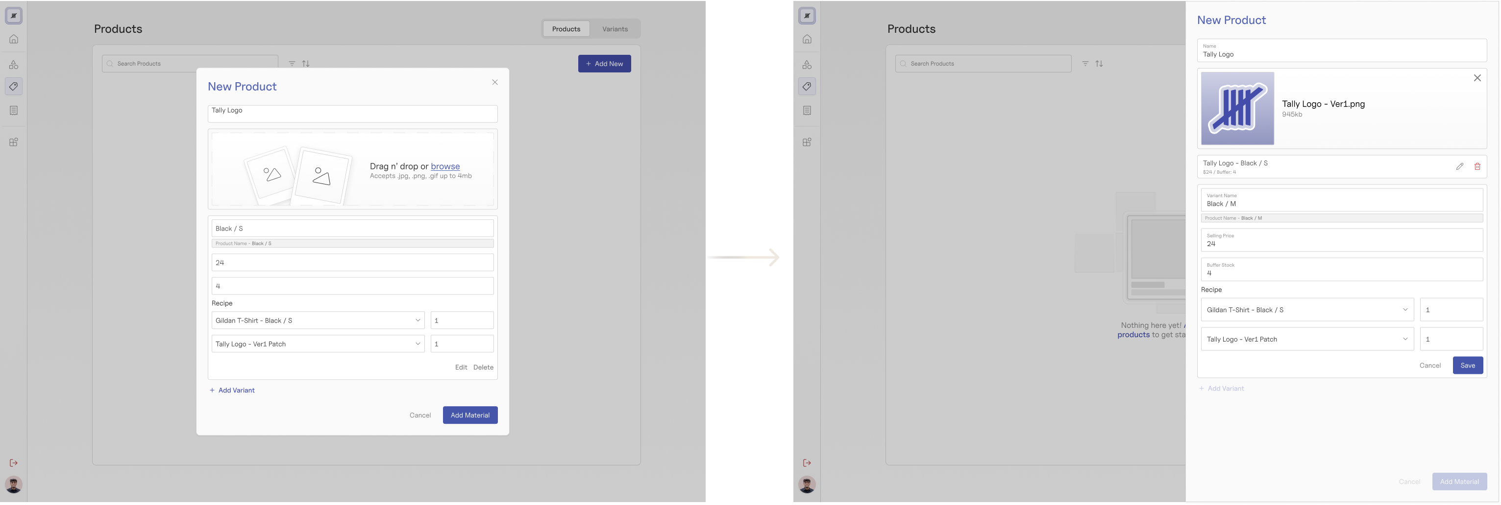 I originally explored modals as a way to handle material and product creation, but modals didn't scale well. With different quantities of variants (sizes, designs, etc.), modals yielded inconsistent heights and blocked contextual information in the primary screen.