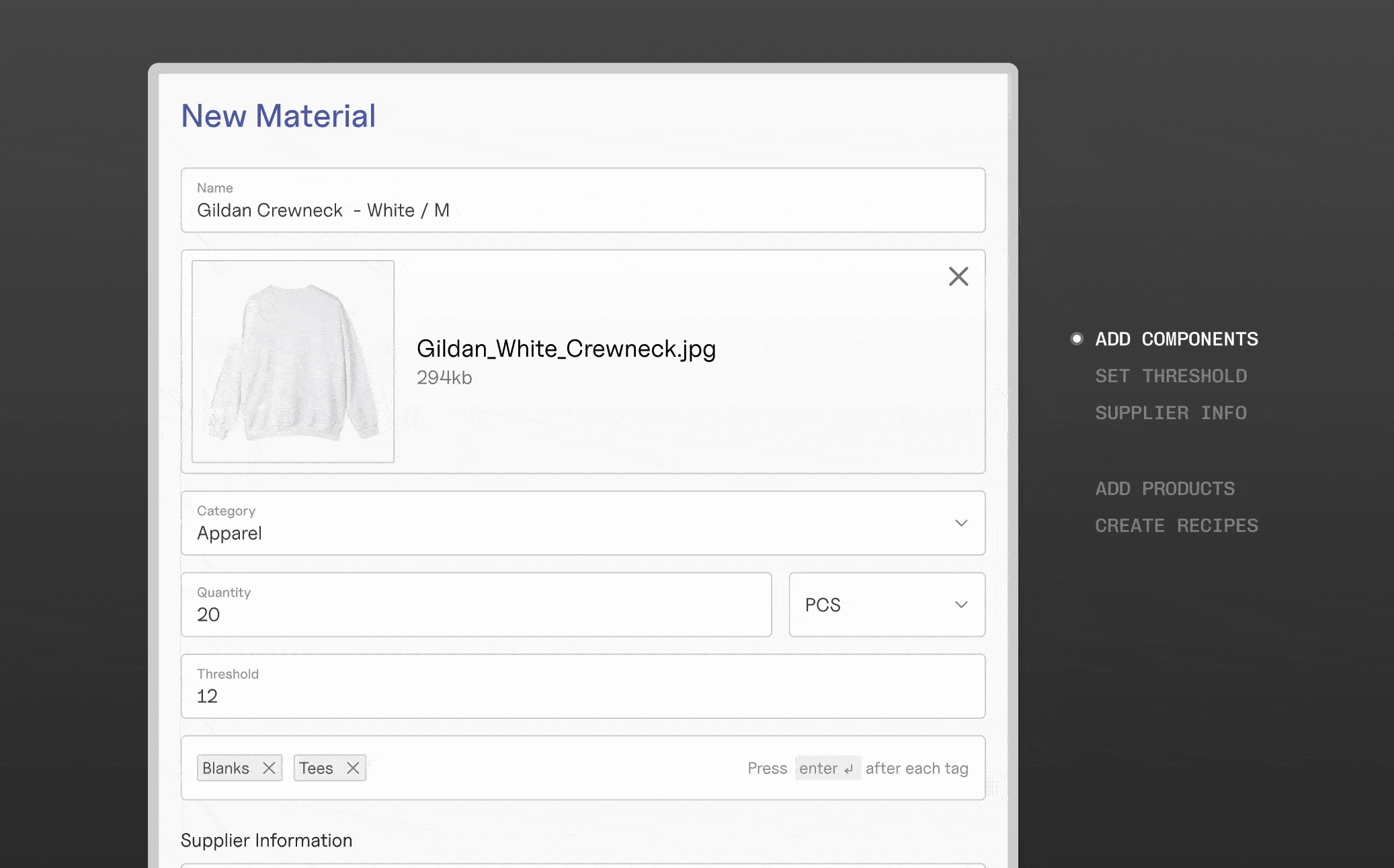 Materials are like your building blocks. Define reorder quantities and safety thresholds and input supplier information to automate replenishment for your most important materials.