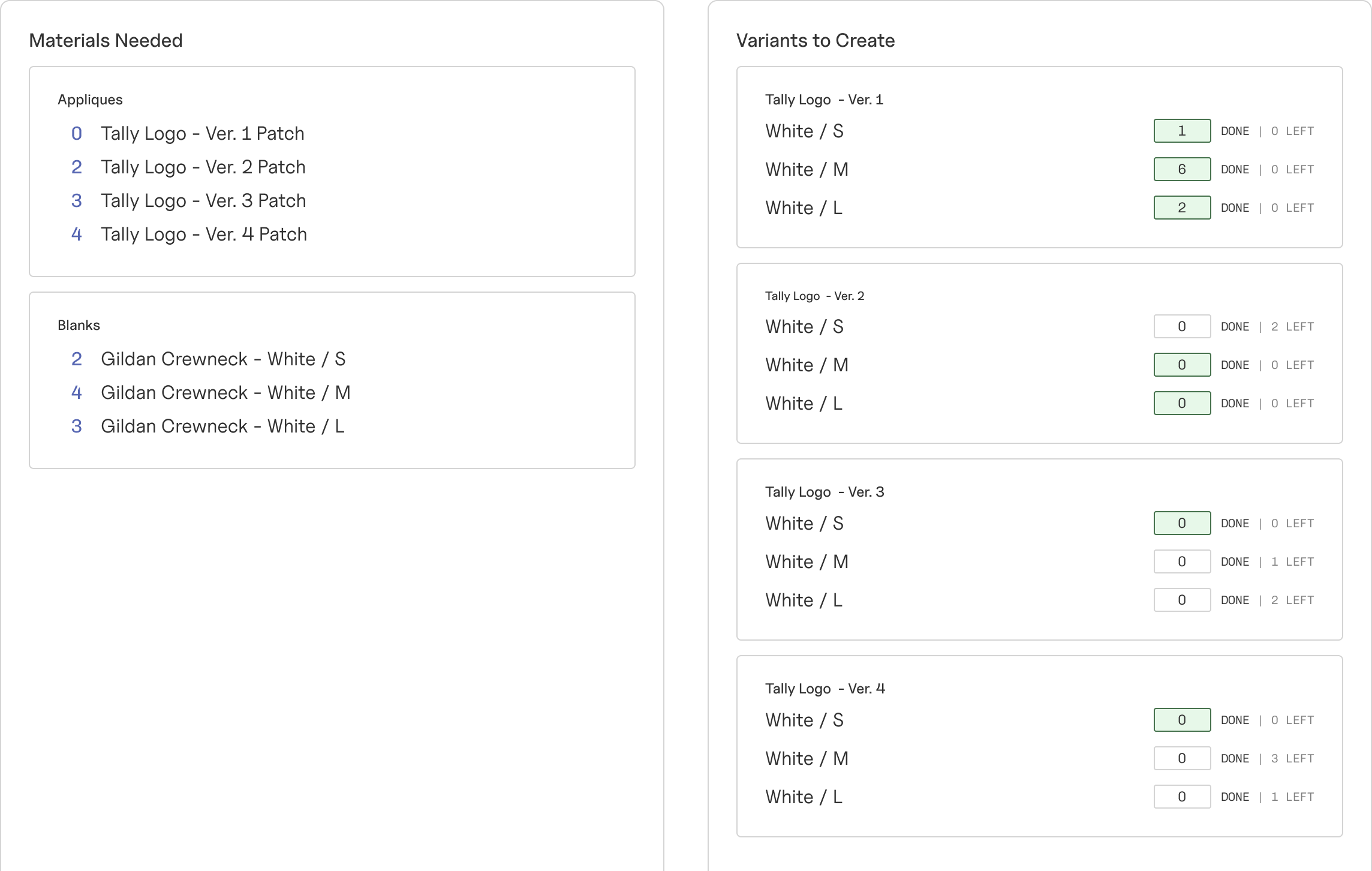 For any unfulfilled orders, Tally provides businesses with a list of materials they need to collect and variants to be made from those materials.
